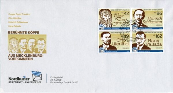Am 24. November 2008 erschien die 8. Briefmarkenedition des Kurierverlages. Geziert werden die selbstklebenden Wertmarken mit ‚Berühmten Köpfen aus Mecklenburg-Vorpommern‘.Die Standardbriefmarke zeigt einen der bedeutendsten Maler der Früh-Romantik. Die Werke des gebürtigen Greifswalder Caspar David Friedrich sind oft durch Landschaftszeichnungen seiner Heimat gekennzeichnet. Heinrich Schliemann, der Pionier der Feldarchäologie und Entdecker Trojas, ist auf der Kompaktbriefmarke abgebildet. Seine Kindheit hat er im ostmecklenburgischen Dorf Ankershagen verbracht, wo seit 1980 sein Elternhaus das Heinrich-Schliemann-Museum beherbergt.Ein weiterer Pionier ziert die Gro&szuml;briefmarke. Der Anklamer Otto Lilienthal legte im 19. Jahrhundert den Grundstein für die Flugzeug-Entwicklung. Auf der Maxibriefmarke ist der gebürtige Greifswalder Rudolf Dietzen, der unter dem Namen Hans Fallada als Schriftsteller bekannt wurde, abgebildet. In seinem Anwesen in Carwitz befindet sich noch heute das Hans-Fallada-Archiv.