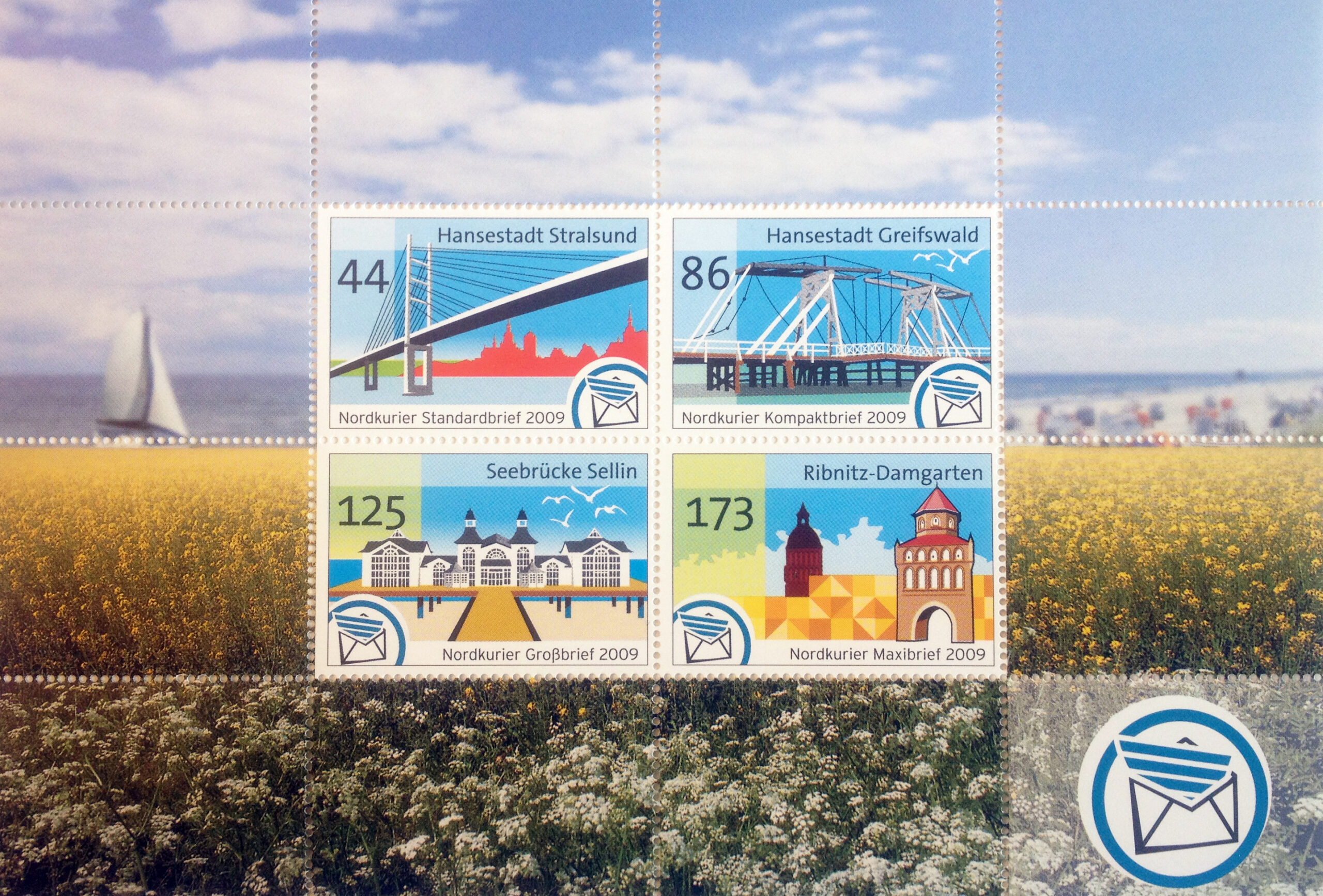 Seit dem 1. April 2009 zieren vier verschiedene ‚Sehenswürdigkeiten in Nordvorpommern‘ die selbstklebendenWertmarken der 9. Briefmarkenedition des Kurierverlages. Die erst 2007 fertig gestellte Rügenbrücke über den Strelasund,eines der längsten Brückenbauwerke Deutschlands, dient als Motivfür die Standardbriefmarke. Auf der Kompaktbriefmarke ist die 1887 errichtete Wiecker Holzklappbrücke, die nach holländischem Vorbild erbaut wurde, abgebildet. Als Motiv für die Gro&szuml;briefmarke dient die Seebrücke Sellin.Mit 394 Metern Länge ist sie die längste Seebrücke der Insel Rügen. Die Maxibriefmarke zeigt gleich 2 Sehenswürdigkeiten in Ribnitz-Damgarten. Zum einen das Rostocker Tor aus dem 15. Jahrhundert und zum zweiten im Hintergrund die Marienkirche von 1233.